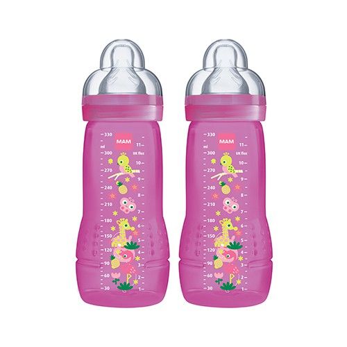 MAM Biberon Easy Active 2ème âge Coloré - 330ml - à partir de 6 mois - Tétine Débit X - Lot de 2 - Fille