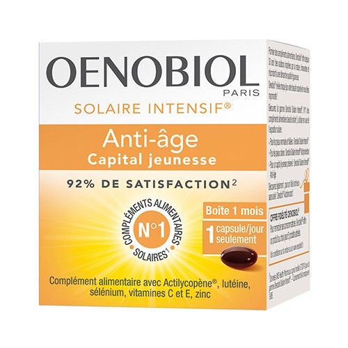 Prenez 1 capsule par jour d'Oenobiol Solaire Anti-Age au cours d’un repas, 1 mois avant l’exposition solaire, pendant et après.