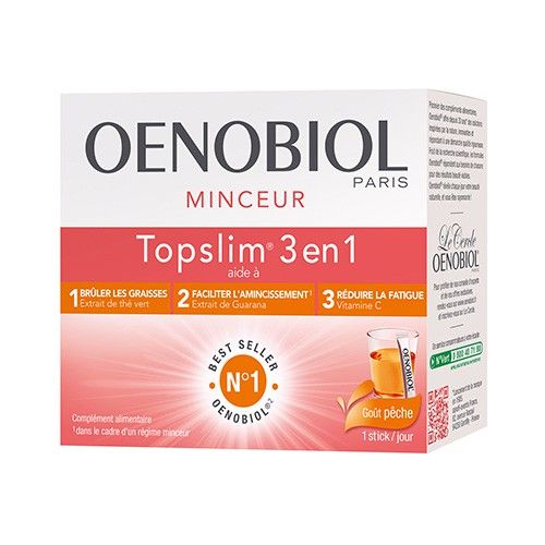 Oenobiol Top Slim 3 en 1 Thé Pêche brûle les graisses grâce à l'extrait de thé vert, facilite l'amincissement grâce à l'extrait de guarana et réduit la fatigue grâce à la vitamine C.