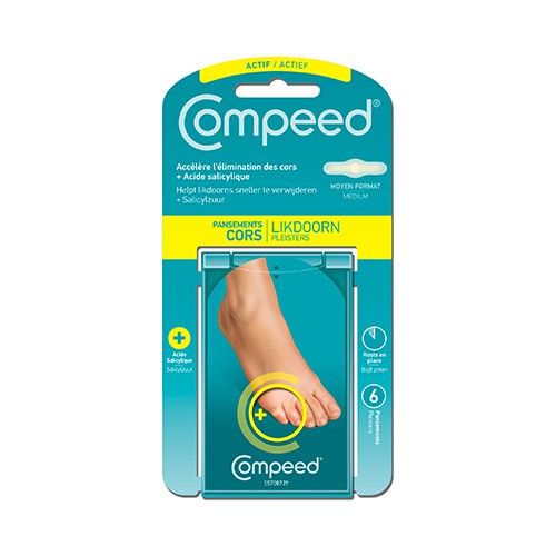 Le pansement Compeed Cors + aide à éliminer les cors grâce à plusieurs actions : il atténue la pression, maintient humide la zone concernée et ramollit le cor grâce à l’acide salicylique.