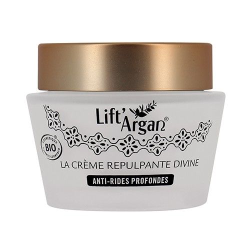 La crème repulpante Divine anti-rides profondes Lift'Argan est un soin à la texture velours, qui nourrit immédiatement les peaux matures pour une double action : comblement des rides et fermeté.