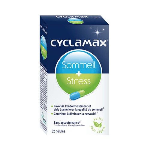 Cyclamax Sommeil + Stress est un complément alimentaire avec une formule complète et double action aux actifs 100% végétaux. Ses actifs favorisent l'endormissement, aident à améliorer la qualité du sommeil (Houblon et Valériane) et contribuent à diminuer la nervosité (Passiflore et Mélisse).